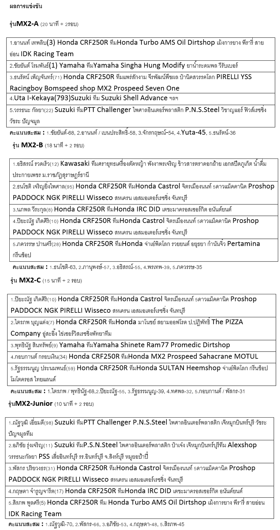 และรุ่น MX2-Junior ที่เป็นรุ่นของนักแข่งยุวชนอายุไม่เกิน 16 ปี โดยทัพพญาอินทรีมีน้องโออิชิ-พัสกร ปริยวงธร เบอร์31 ศิษย์ก้นกุฏิอีกคนของพ่อมดดำจันทบุรี-เอส มอเตอร์เรซซิ่ง ที่ทำผลงานคว้าตำแหน่งที่ 2 ติดต่อกัน 3 สนามแล้ว เป็นตัวความหวังคู่กับเจ้าแซ้งค์-กฤษดา จำรูญจารีต เบอร์17 ของทีม Honda IRC DID เตชะมาครอสเซอร์กิต อนันต์ยนต์ ซึ่งสภาพร่างกายไม่เต็มร้อยมาจากการล้มจนกระดูกแขนหักในการแข่งขันที่สนามสุโขทัย
