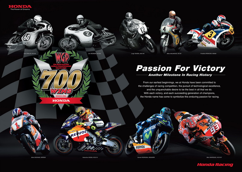 ด้วยเกียรติประวัติอันยาวนานในวงการแข่งขันรถจักรยานยนต์กว่า 55 ปีมานี้ทำให้ Honda ถือเป็นค่ายรถจักรยานยนต์ยักษ์ใหญ่ที่เป็นผู้นำในวงการ Motorsport อย่างแท้จริงจากการคว้าชัยชนะในรายการระดับโลกมานับไม่ถ้วนเป็นจำนวนถึง 700ครั้งด้วยกัน