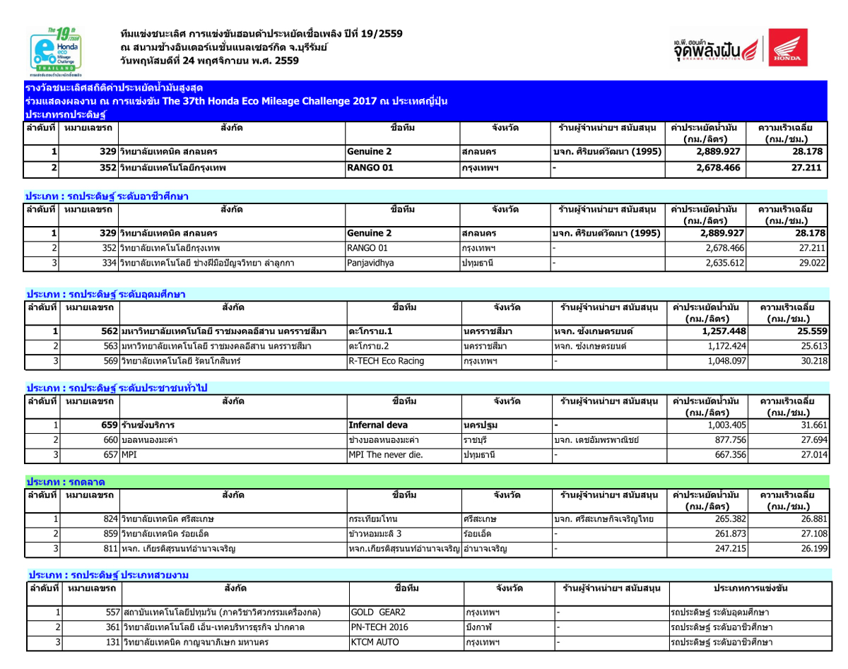 ผลการแข่งขันฮอนด้าประหยัดเชื้อเพลิงปีที่ 19 คลิ๊กที่นี่เพื่อดู ผลการแข่งขันรถตลาดคลิ๊กที่นี่เพื่อดู ผลการแข่งขันรถประดิษฐ์กลุ่มอาชีวะคลิ๊กที่นี่เพื่อดู ผลการแข่งขันรถประดิษฐ์กลุ่มอุดมศึกษาคลิ๊กที่นี่เพื่อดู ผลการแข่งขันรถประดิษฐ์กลุ่มประชาชน